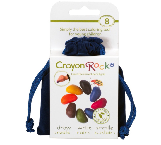 Ergonomische Vetkrijtjes, Wasco van Crayon Rocks. In een blauw velours zakje met 8 verschillende levendige kleuren. Crayon Rocks zijn gemaakt van sojabonen uit de VS en zijn gekleurd met natuurlijke minerale pigmenten uit planten, volledig natuurlijk en niet toxisch. Vanaf 3 jaar.