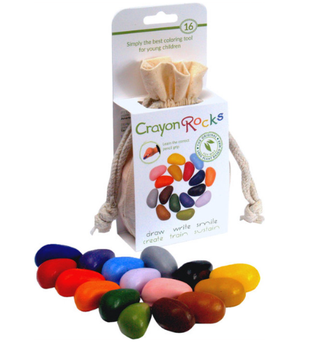 Ergonomische Vetkrijtjes, Wasco van Crayon Rocks. In een katoenen zakje met 16 verschillende kleuren. Crayon Rocks zijn gemaakt van sojabonen uit de VS en zijn gekleurd met natuurlijke minerale pigmenten uit planten, volledig natuurlijk en niet toxisch. Vanaf 3 jaar.