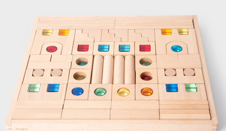 De set bevat gladde houten blokken, levendige edelsteenblokjes, glinsterende edelsteenringen en betoverende caleidoscoopblokken, allemaal netjes verpakt in een stevige beukenhouten tray met duidelijke richtlijnen op de bodem. Zo is opruimen net zo leuk als spelen!