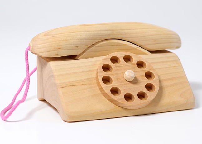 Hallo, hallo wie is daar? Een houten telefoon. kinderen vinden het geweldig om papa en mama na te doen.