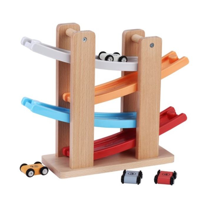 Plaats de autootjes boven in de racebaan en kijk hoe ze zig-zaggend naar beneden komen. De houten autobaan wordt geleverd met vier autootjes.