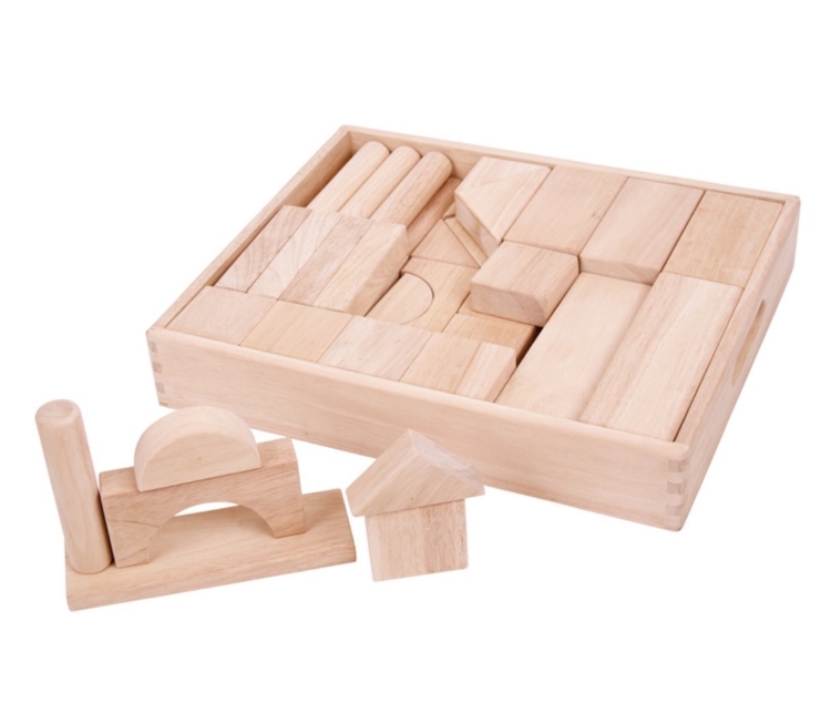 Deze grote houten bouwblokken van Big Jigs (54-delig) stimuleren de fantasie. De blokken hebben, net als veel ander houten speelgoed, een "open einde". Dit houdt in dat het meerdere dingen tegelijk kan zijn. Met deze houten blokken kun je dierentuinen, gebouwen, eilanden, huizen en parkeerplaatsen maken. Het stimuleert de fantasie, de creativiteit en daagt kinderen uit. Grote houten blokken stimuleren de motoriek en het ruimtelijk inzicht. Want hoe zorg je dat die toren goed blijft staan? Kan er ook een kasteel van gebouwd worden? Met deze blokken van Big Jigs hebben kinderen jaren plezier. De dreumes maakt torens van de houten blokken, peuters en kleuters gebruiken het bij fantasiespel of maken er nog ingewikkelder bouwwerken mee. Wanneer de kinderen klaar zijn met het spelen en de blokken opgeborgen mogen worden, kan dat eventueel in de meegeleverde, stevige, houten bak. Afmetingen 45.5 × 38.4 × 7 cm.