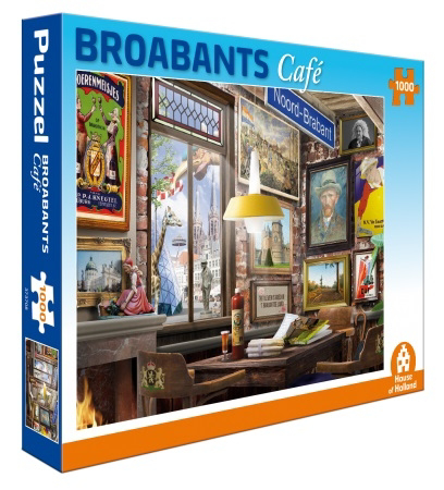Legpuzzel van 1000 stukjes met op de puzzel een café waar allerlei dingen uit Brabant te vinden zijn zoals bijvoorbeeld attracties van de Efteling en een schilderij van Vincent van Gogh. Afmetingen puzzel: 68 x 48 cm.