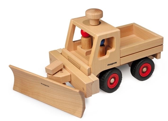 Mooie beuken houten Unimog. Bestuurbaar met de knop bovenop. Komt met 2 poppetjes. De Unimog is uit te breiden met een Fagus sneeuwschuiver, een Fagus zoutstrooier, een Fagus kraan of een Fagus straatveger. Lengte 25 cm. Vanaf 2 jaar.