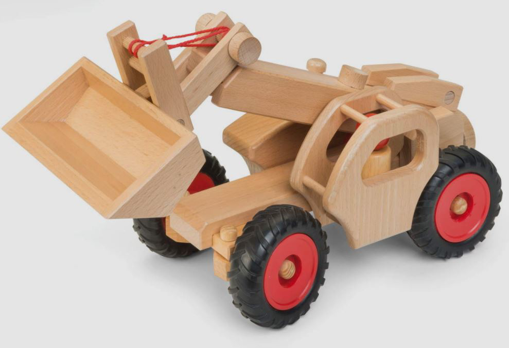 Houten telescooplader (ca. 29 cm. lang) bestuurbaar en hoogteverstelbaar. Massief Beukenhout, Duits handwerk. - stuurbaar - incl. 2 poppetjes - incl. 1 laadvork - incl. 1 blade - extendable cantilever - in hoogte verstelbaar - unit carrier adjustable in the angle of inclination - axle steering system Vanaf 3 jaar