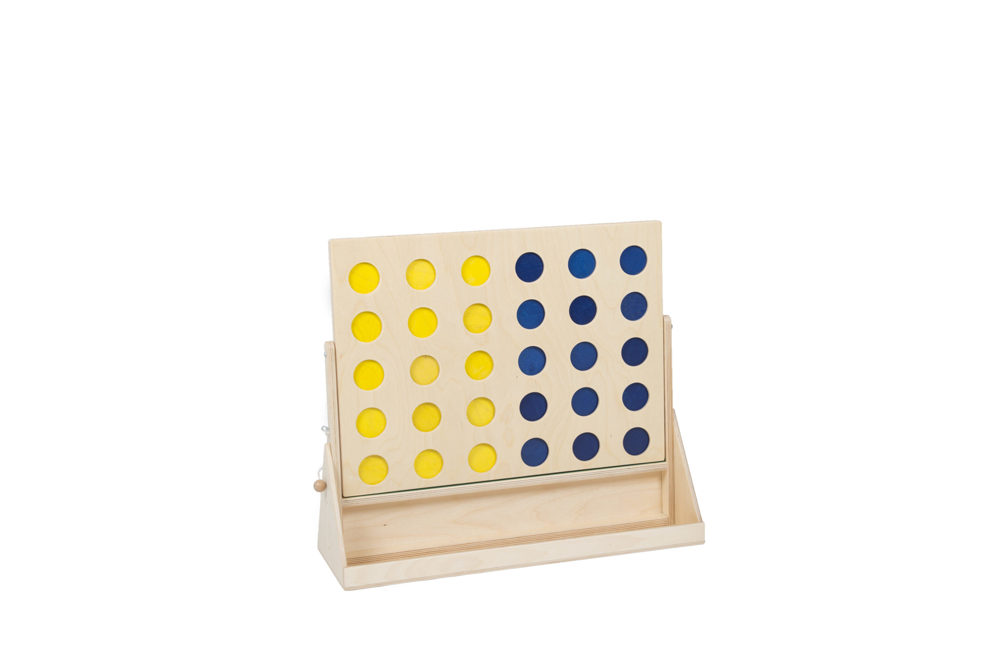Extra grote uitvoering van de vier op een rij. Met opvangbak voor de stenen. De kleuren van de stenen zijn blauw en geel wat voor mensen met een visuele beperking ook te spelen is. Deze prachtige vier op een rij heeft 12 gele en 12 blauwe stenen. Hierdoor ook geschikt voor mensen met een visuele beperking.